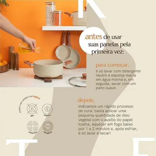 antiaderentes, com alta qualidade e design moderno, são ótimas para fazer suas receitas favoritas sem perigo de grudar alimentos ou ingerir substâncias tóxicas. a combinação de cores em tons terrosos com acabamento fosco harmonizam com a decoração da cozinha e levam charme ao ambiente!