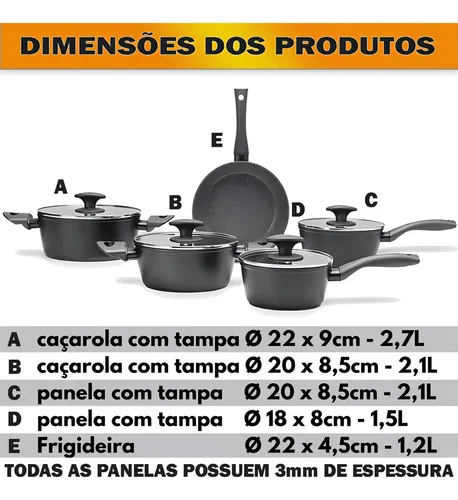 01 Frigideira sem Tampa: Diâmetro 22cm Altura 4,5cm; Capacidade 1,2 litros